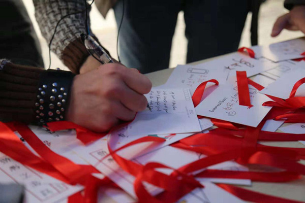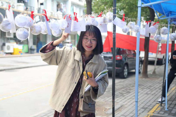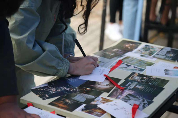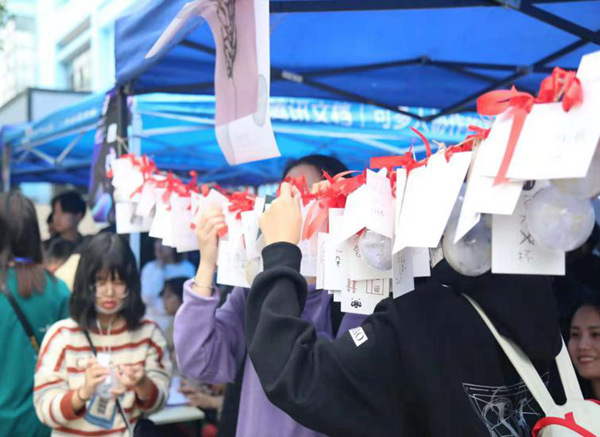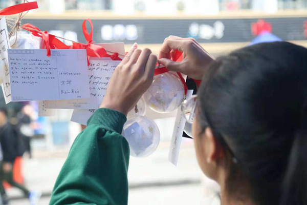 中午,同学们被明信片和心愿球吸引,每个人都写下来自己的小愿望,将明信片系上红绳,挂在心愿球旁,等待能实现的人来领取,希望能够有人替他们实现。一名参与的新生表示,他十分好奇且激动,等待着有缘人通过他们留下的联系方式与他们取得联系。