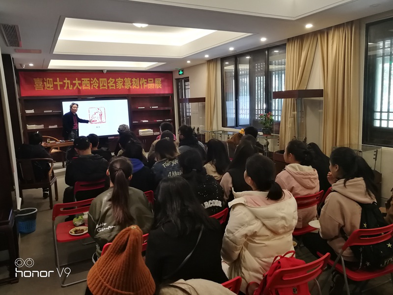 讲座前,师生们参观了“喜迎十九大西泠印社四名家吴莹、柳晓康、林尔、沈正宏篆刻作品展”。随后,来自2015、2016级公共艺术专业为主的学生聆听了篆刻名家陈宝福关于世界非物质遗产——篆刻文化的专题讲座。陈宝福先生用幽默诙谐、深入浅出的讲解,为师生系统介绍了篆刻文化的发展史和篆刻艺术的欣赏方法、基本设计造型等知识,并现场演示了篆刻刀法等艺术技艺。本次活动让师生受益匪浅,能够直观、深入地感受到我国传统篆刻艺术的博大精深,也激发起学生们对中国国石文化和篆刻艺术的学习研究兴趣。