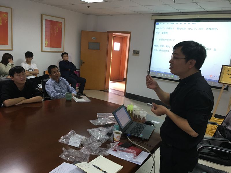 随后,朱春良总经理为工业设计系师生分享了一场精彩的讲座。他介绍了最新的设计材料、加工工艺等专业知识,生动地讲解了设计专业经验,并将3D打印四种不同材质的计量器物模型赠送给学院。