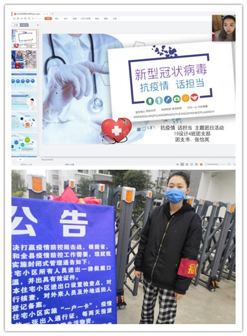 19设计4班支部的团日活动中,团支书通过PPT的形式向全班同学分析科普了新型冠状病毒的相关知识及防范措施,分享战“疫”故事,学习抗疫奉献精神;班主任吴烨老师参加并与同学一起交流防疫知识,并对疫情期间的学习做了指导,叮嘱大家相互督促做好时间管理,确保网络教学“一个不落下”,营造良好的居家学习交流氛围。