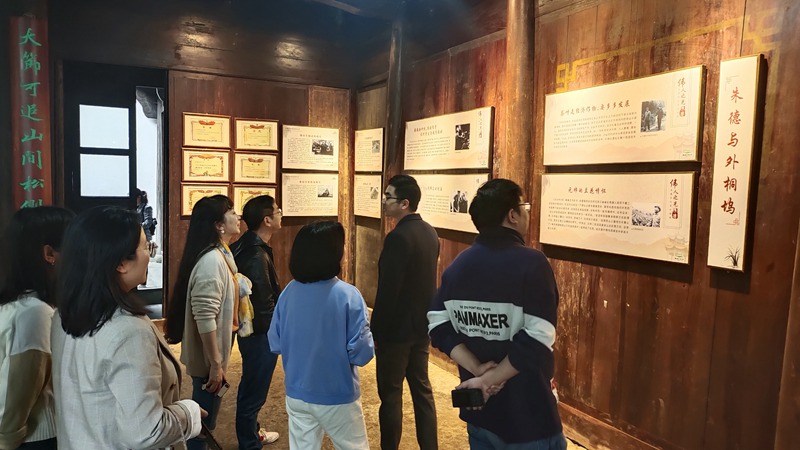 接着,走进外桐坞村朱德纪念馆参观学习,重温老一辈无产阶级革命家的高尚情怀,追忆红色的峥嵘岁月,感受革命领袖对杭州的深情厚谊。朱德总司令曾四次来到外桐坞村视察调研指导茶村的发展规划,与村民们一起开垦荒山,种植、采摘、炒制茶叶,对外桐坞村的建设和发展产生了深远的影响,依托外桐坞景区的自然人文资源,2011年,外桐坞村把一幢有着170多年历史的原村委会办公场所,按照当年朱德视察时的原貌进行了修建恢复成了朱德纪念室,纪念室门口特意设置了一组情景还原的铜像雕塑;纪念室对朱德元帅的纪律作风、家风故事和政绩等内容进行充分挖掘和整合提炼,充分展现了老一辈无产阶级革命家崇高的人格魅力和优良的家风品德。外桐坞村还以“元帅”之名,相继在村中开辟建成了元帅茶园、元帅亭、元帅井、元帅广场等形成了“朱德文化”景观。