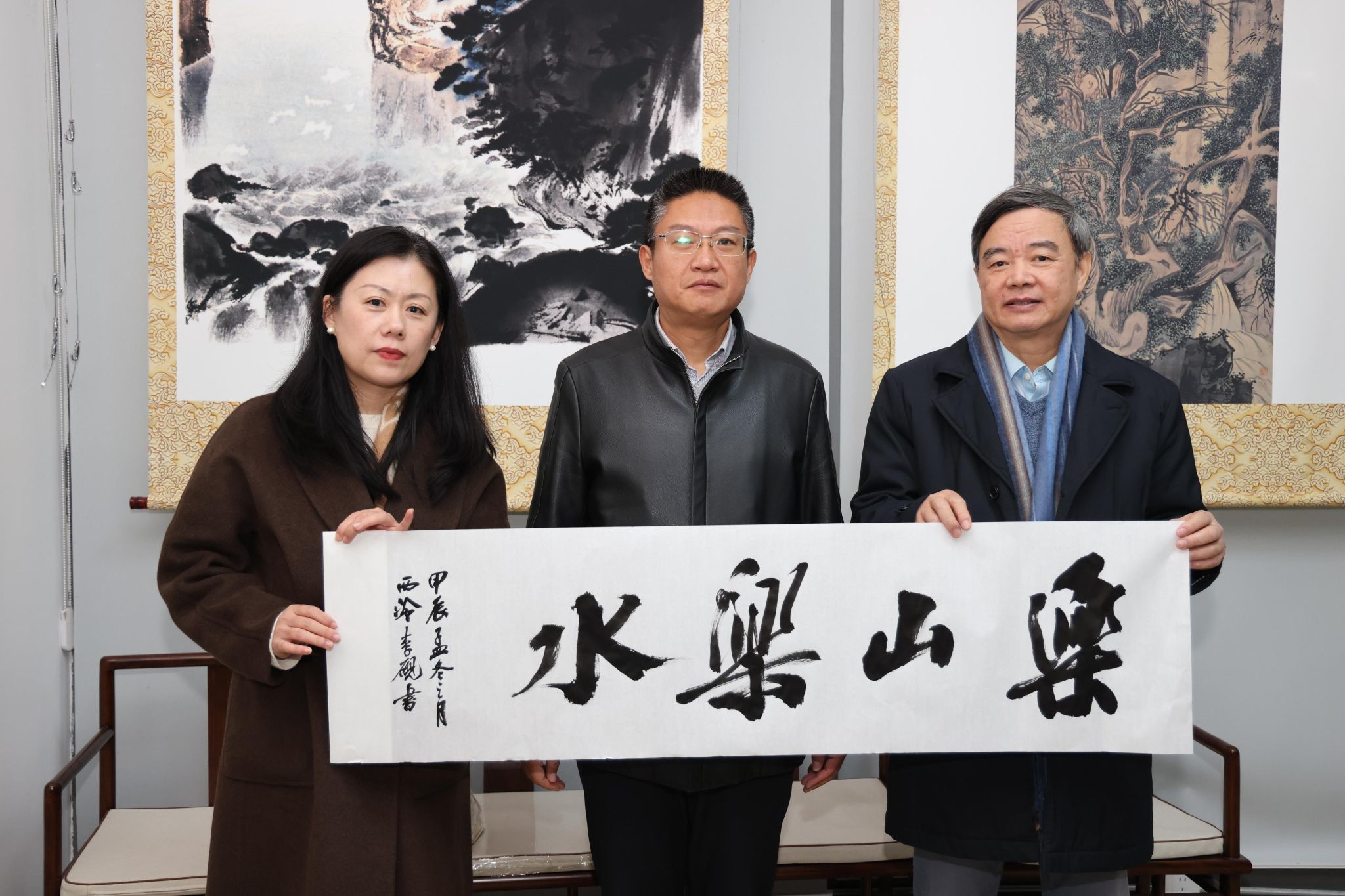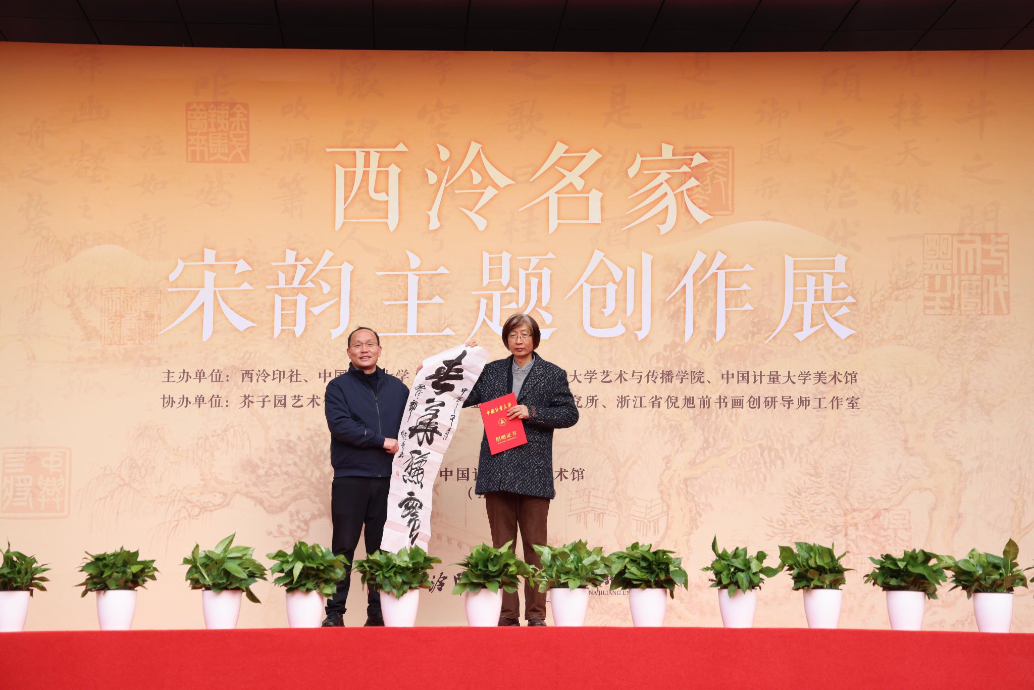 西泠印社理事郭超英、倪郡阳两位艺术家分别向学校美术馆捐赠书法作品。西泠印社党委委员、社委会副主任邵建华,宣传部副部长王颖向其颁发捐赠证书,并对两位艺术家支持高校艺术教育的深厚情怀表示崇高的敬意和诚挚的感谢。